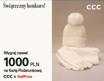 Hej, słyszysz to? Świąteczny konkurs CCC właśnie wystartował! Możesz wygrać nawet 1000 złotych na zakupy w CCC i HalfPrice dla siebie lub bliskich! Wystarczy, że kupisz Kartę Podarunkową, dołączysz do klubu i zarejestrujesz zgłoszenie w formularzu, odpowiadając na pytanie konkursowe! Zeskanuj kod QR dostępny w sklepie lub odwiedź stronę konkursową dostępną na CCC.EU i zyskaj szansę na spełnienie zakupowych marzeń! Termin konkursu: od 2 do 24 grudnia. Szczegóły w regulaminie.